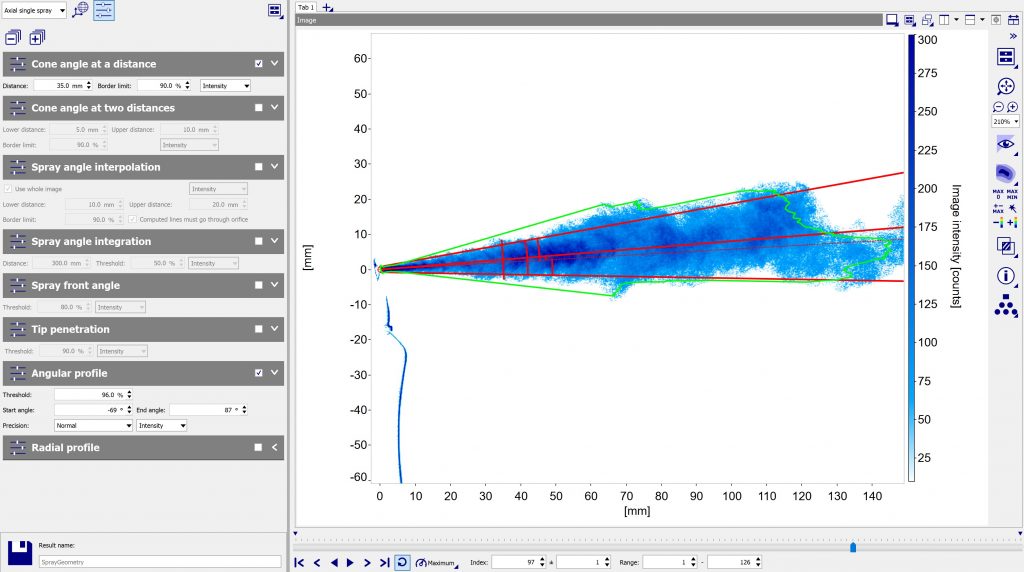 - Sprühdichteprofile: Verteilung der Partikelkonzentration über Breite und Tiefe des Sprays
