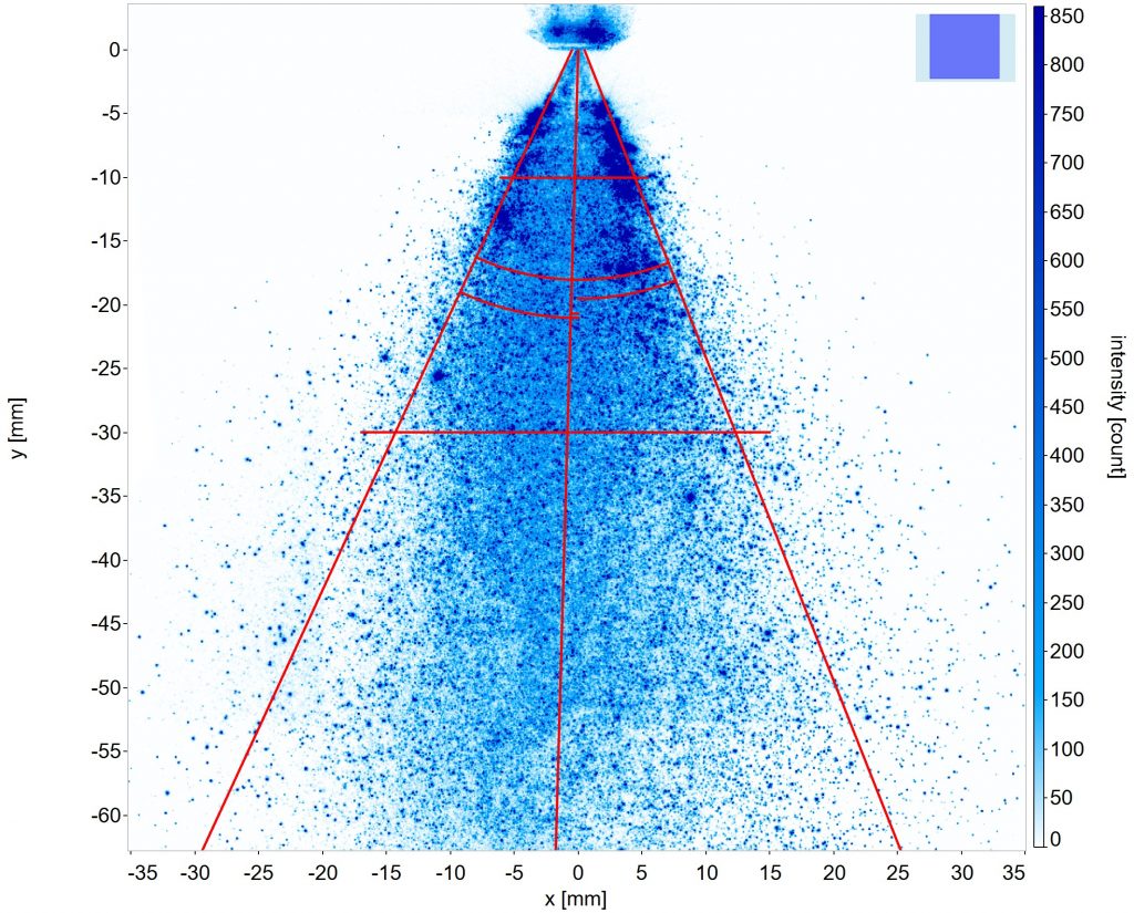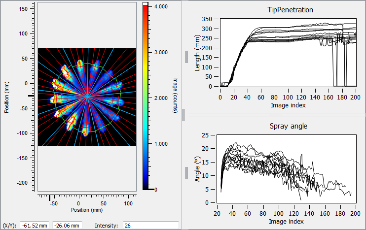 - Abhängig von der optischen Anordnung liefert DaVis Daten über das Spray Muster (Radiale Schnitte) oder über die Strahlform (axiale Schnitte).
