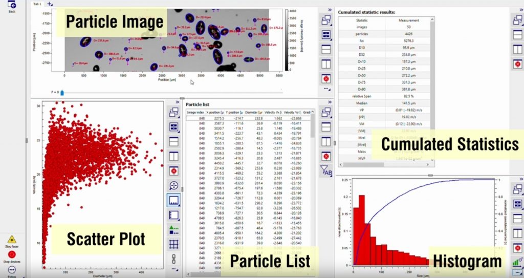 - Partikelgrößenverteilungsspektrum: Erfassung von Minimal- bis Maximaldurchmesser zwischen 10 – 2.500 µm je nach Ausstattungsmodell und nach Applikation