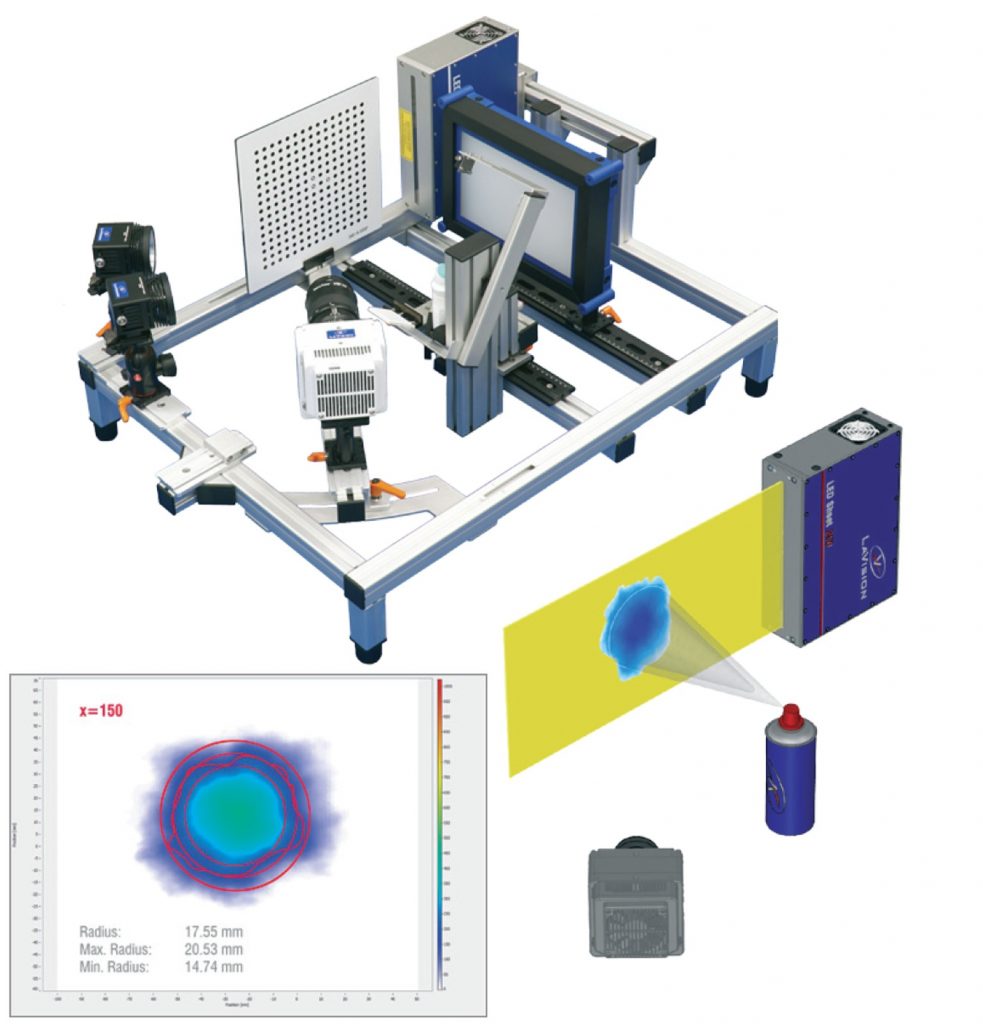 Der SprayMaster inspex Base Frame, als Basis-Ausstattungs-Konzept, bildet die zentrale Plattform des Systems. Mit einer universellen Halterung können Sprühflaschen, Sprühdüsen und andere Applikatoren verschiedener Formen und Größen sicher positioniert werden. Die Messungen erfolgen über hintergrundbeleuchtete Bildgebung, Lichtschnitt-Technologie und Schattenbildanalyse, die eine vollständige Charakterisierung des Sprühprozesses ermöglichen. Das System ist speziell für den Einsatz in Forschungslaboren und Produktentwicklungsumgebungen konzipiert.